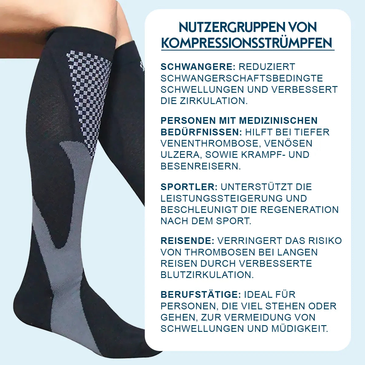 • Berufstätige: Für Personen, die lange stehen oder gehen, zur Vermeidung von Ermüdung und Schwellungen.